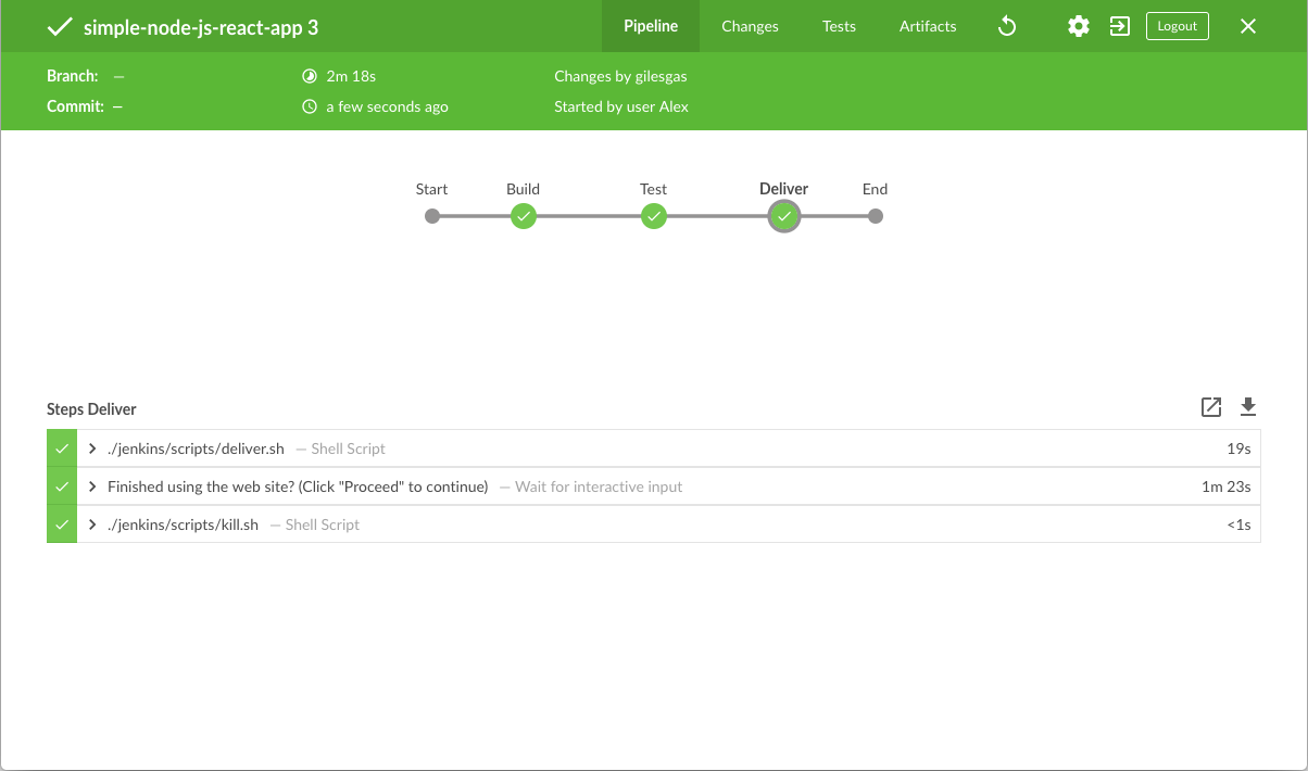 当你查看完页面/站点, 点击 Proceed 按钮以完成 流水线的执行。
